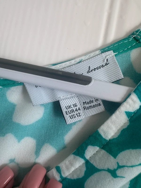 A stunning blue and green floral midi dress featuring a v-neckline. The dress has a flowing silhouette and sits on the mid-calf at 5ft 8. Perfect for casual outings.