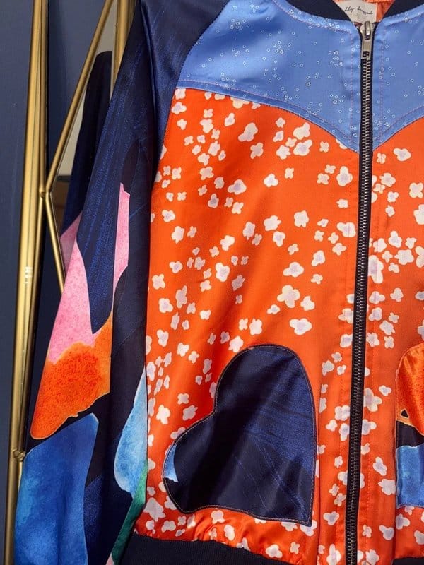 Vibrant multi-colored Bomber Satin Jacket fully lined, crafted in smooth satin fabric, featuring heart pockets. Ideal for cooler summer days or evening events, it is a unique statement piece, perfect for making an impact. With a full-length zipper, this stylish jacket offers both comfort and elegance.