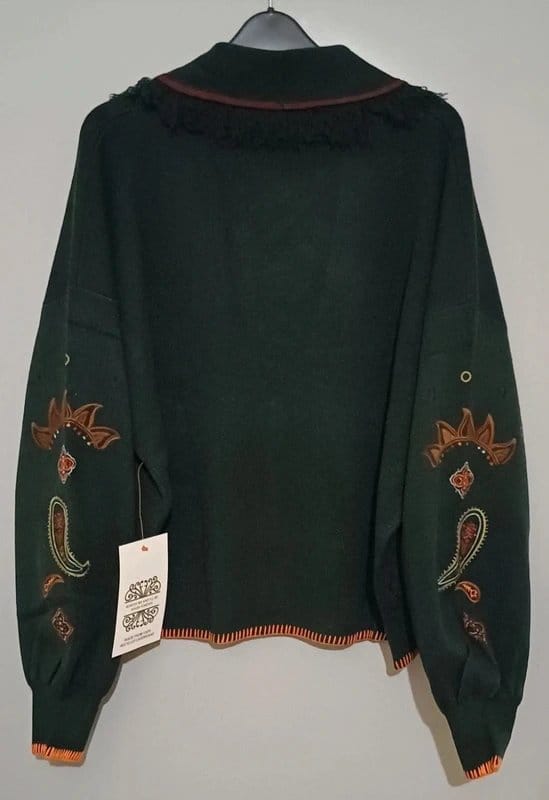 This soft cardigan is crafted from a luxurious knit that's perfect for cosy settings. Embroidered parsley patterns and motifs add a vibrant pop of colour, while fringe detailing along the sleeves and chest elevate this classic silhouette. It is in immaculate condition, new with tags.