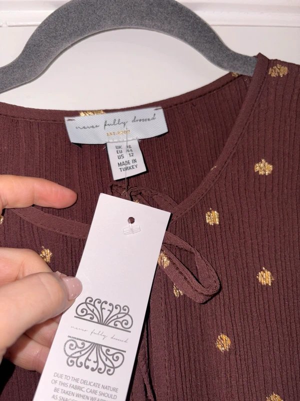 Lovely Never Fully Dressed Brown Gold Spotty Plisse Midaxi Dress Size 16. Great for a party occasion. New with tags.