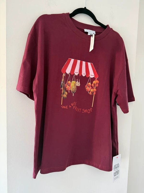 The Never Fully Dressed Playful Burgundy T-shirt is available in sizes L.