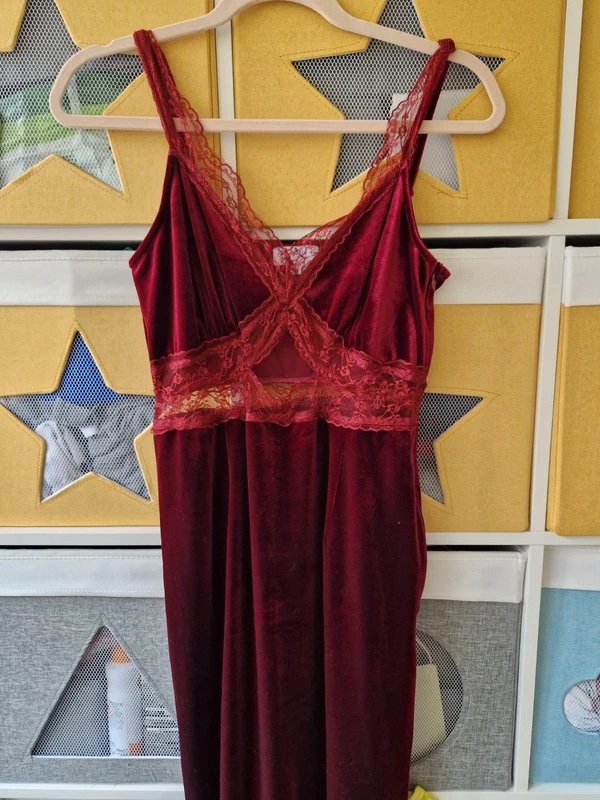Burgundy Velvet Maxi Dress — the must-have occasion dress for special events. Designed in deep burgundy red, this maxi dress features lace and cut-out detailing, adjustable straps, and a skimmed figure silhouette. Crafted from velvet, it is perfect for special occasions. True to size, though size up if you're on the larger size on top.