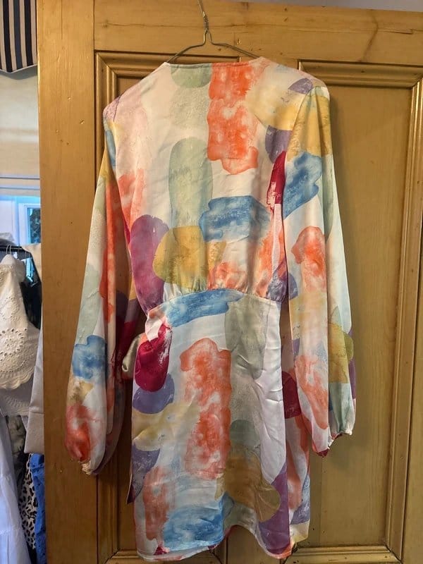 View Vinted's returns policyThis Never Fully Dressed midi dress features a vibrant floral print in multiple colours. Made from silk, it has a wrap-around belt for a flattering fit. Ideal for casual outings or evening events.