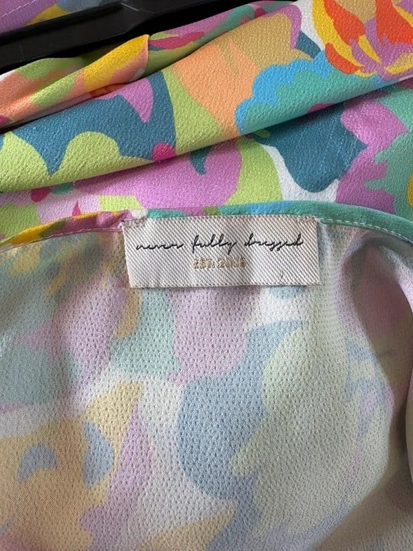 This Never Fully Dressed set includes a wrap mini skirt and a cami, both in a size small. The set features a vibrant summer print that is absolutely stunning. Despite a few minor snags, they are not noticeable due to the bold print. Perfect for summer wear.
