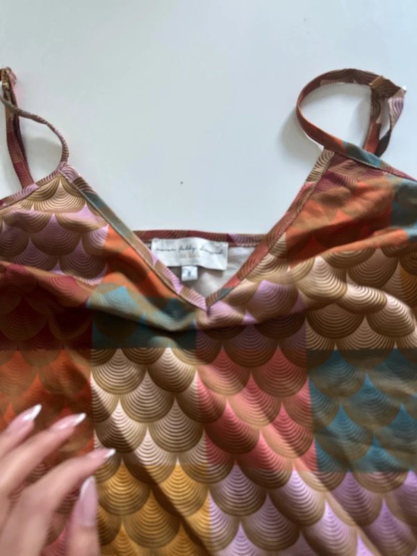 This cami top from Never Fully Dressed is perfect for adding a pop of color to your wardrobe. Featuring a multi-colored print with a scoop neckline and adjustable straps, it offers a stylish and versatile piece for various occasions.