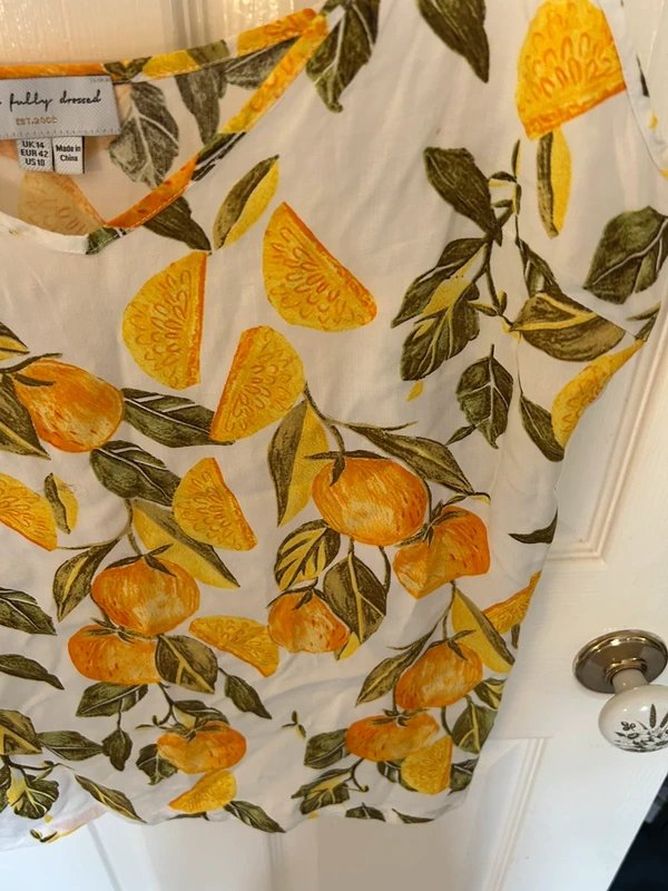 This gorgeous summer piece features a delightful orange and yellow pattern for a fresh look. It is designed with a scoop neckline and short sleeves, making it perfect for warmer days.