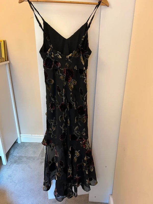 A stunning midi/maxi dress with an asymmetrical frill hem and adjustable straps. Made from a blend of chiffon and velvet, this dress is perfect for festive occasions. The velvet pattern adds a touch of luxury.