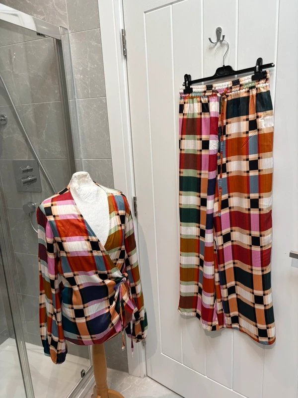 Multi-Color Checked Long Sleeve Waistcoat — the must-have statement piece for any outfit. Designed in a vibrant multi-color checked pattern, this long-sleeve waistcoat features a wrap-around design and a button closure for a flattering fit. Crafted from lightweight sheer silk with subtle sheen, it catches the light beautifully. Includes a full-length jersey slip lining for comfort and coverage.