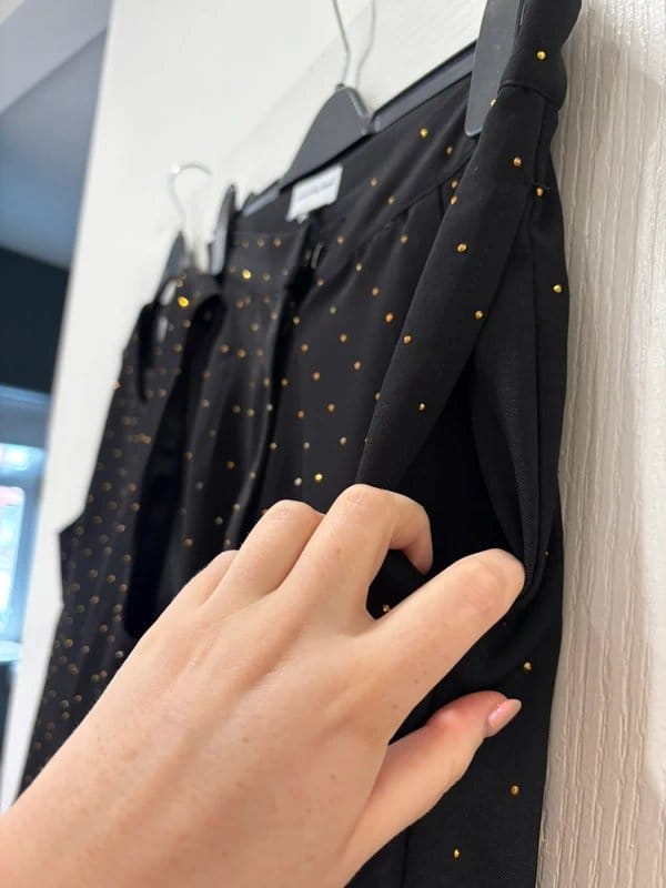 View Vinted's returns policyElegant black co-ord set from Never Fully Dressed featuring a polka-dot waistcoat and matching polka-dot trousers. Perfect for a chic and coordinated look.