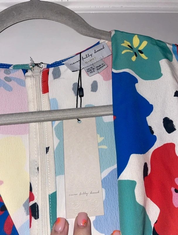 Lovely Never Fully Dressed floral midi dress in a vibrant mix of colors. Perfect for a summer stylish wedding guest look.