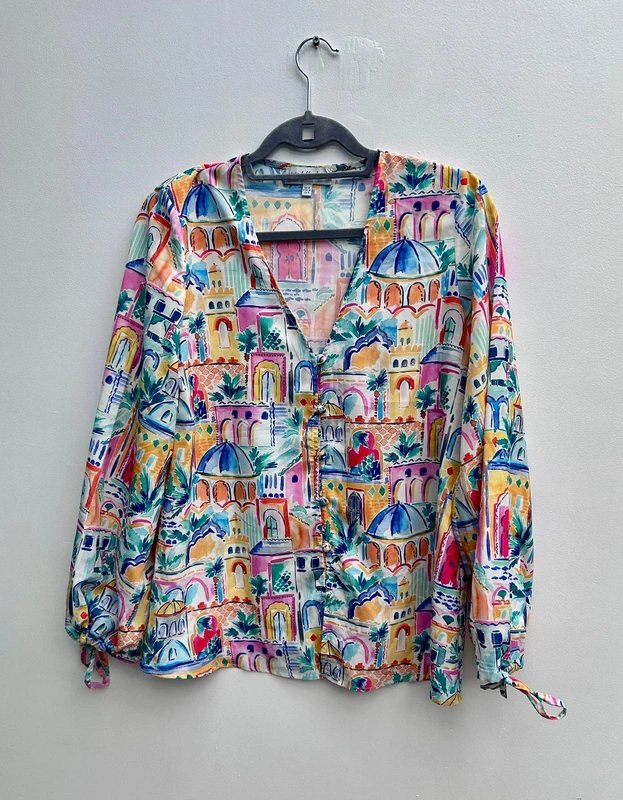 Vibrant Never Fully Dressed co-ord set featuring a painterly architectural print throughout. The set includes a lightweight button-front blouse with a flattering V-neck and long sleeves, paired with matching trousers for an effortlessly chic statement look.