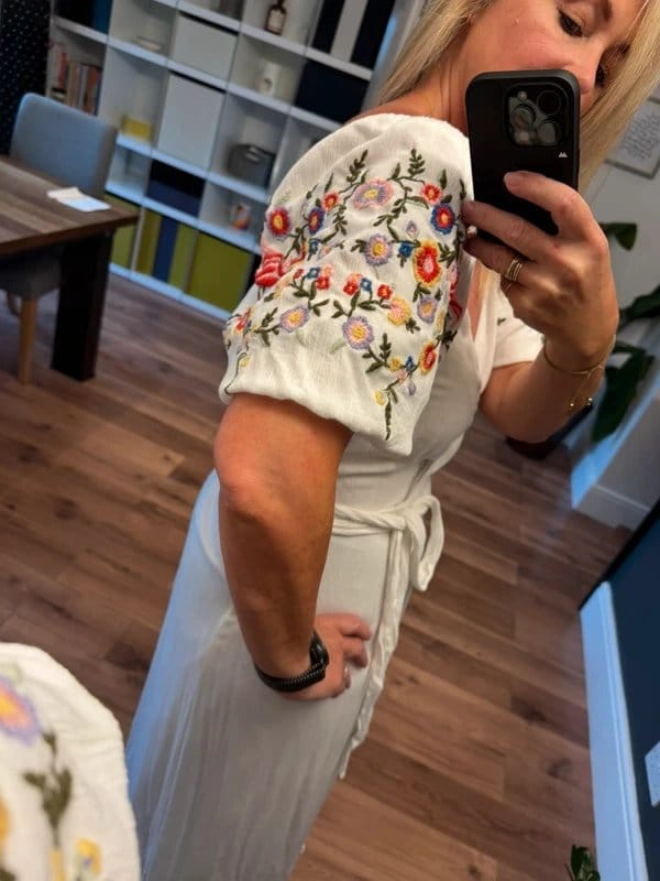 The Never Fully Dressed Embroidered Wrap Dress in White is ideal for casual, weekend, beach.
