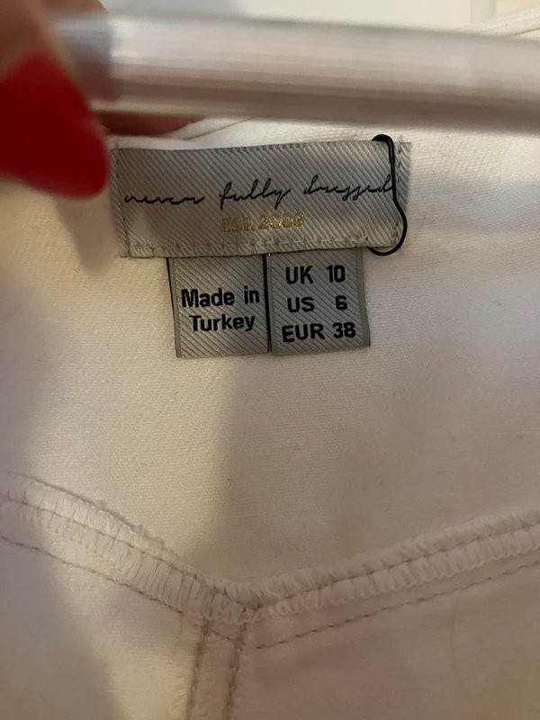 Crafted with cream-colored denim, this Never Fully Dressed jumpsuit features a jumpsuit style. Ideal for a relaxed yet polished look, this piece can transition from casual outings to more formal settings.