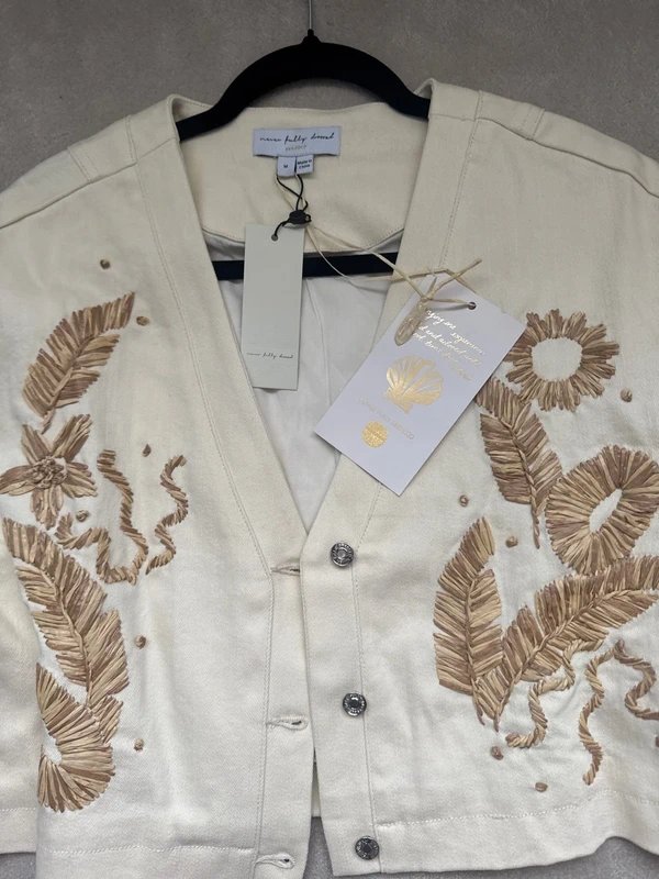 A brand-new, cream denim jacket from Never Fully Dressed, perfect for a casual day out. Featuring embroidered floral patterns, this button-front jacket adds a stylish touch to any outfit.