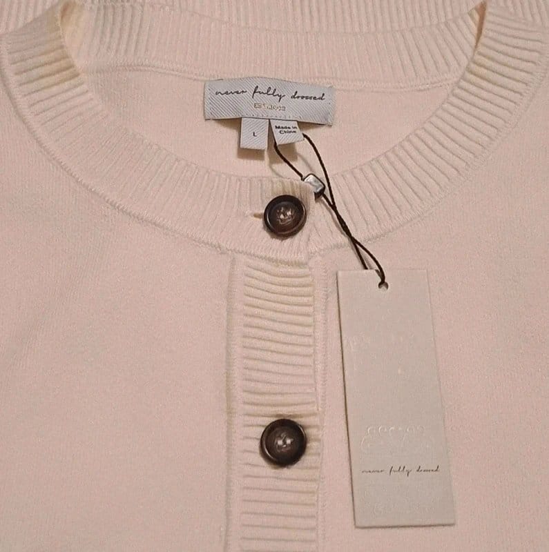 This cream embroidered knitted cardigan by Never Fully Dressed features a soft ribbed texture and elegant embroidery for a touch of sophistication. Perfect for layering over your favourite tops.