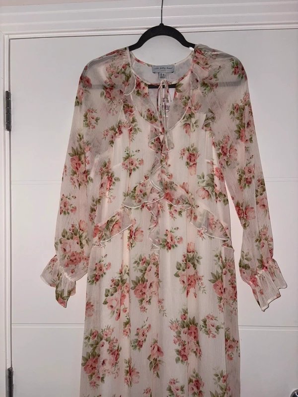 Lovely Cream Pink Floral Frill Long Sleeve Midi Dress in size 10. New with tags, perfect for modest wedding guests.