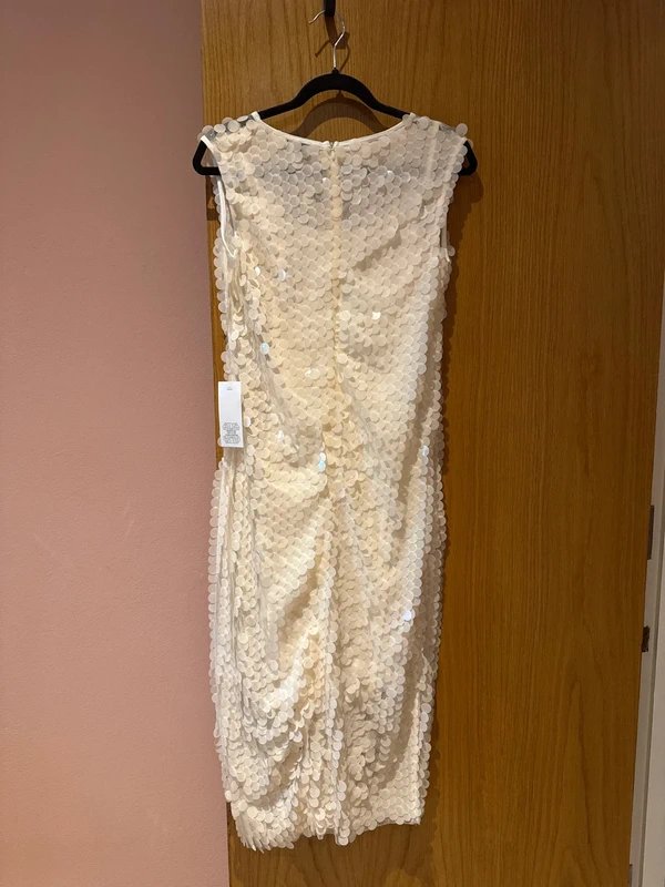 The Never Fully Dressed Cream Sequin Dress is available in sizes S.