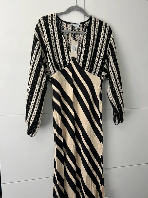 This black and cream crochet dress features a unique striped pattern and a flattering silhouette. Perfect for special occasions, the round neckline and full-length sleeves add a touch of elegance.