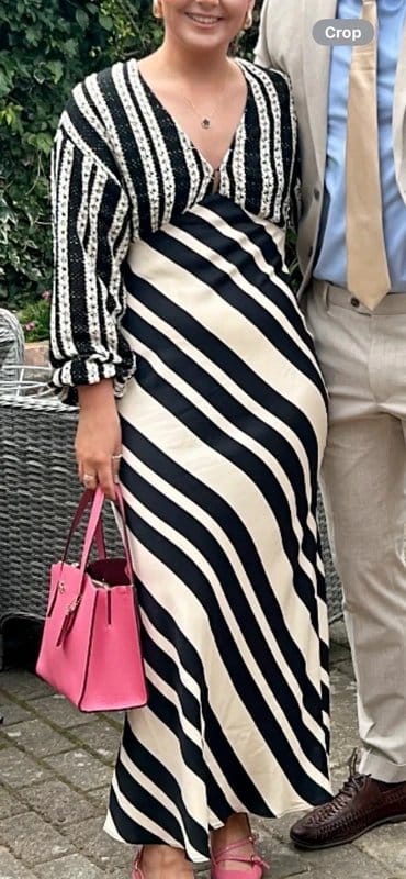 View Vinted's returns policyThis Never Fully Dressed dress features a black and cream striped crocheted design. The V-neckline and long sleeves add a touch of elegance. The maxi length and flowing silhouette make it perfect for summer events or casual outings.
