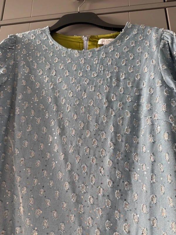 The Never Fully Dressed Light Blue Denim Dress UK14 is made from denim, sequins.