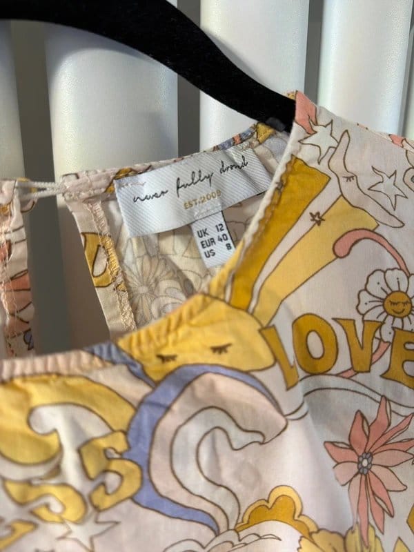 This Never Fully Dressed dress features a vibrant floral print in multiple colours. The lightweight fabric offers a comfortable and airy feel, perfect for casual outings. The dress has a relaxed fit and a slightly loose silhouette, making it easy to wear.