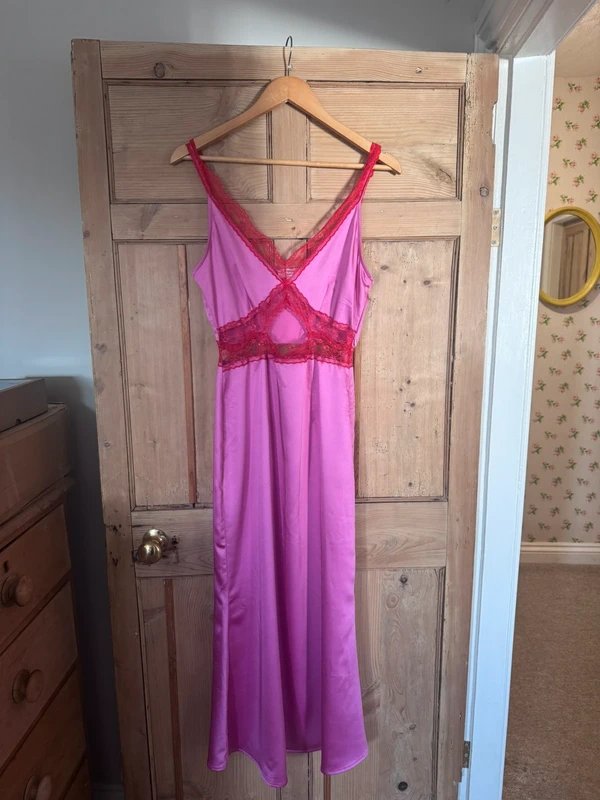 The Never Fully Dressed Pink Lace Midi Dress is available in sizes S.