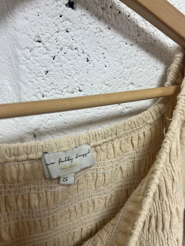 The Never Fully Dressed Off-Shoulder Ruched Dress in Beige is available in sizes S.