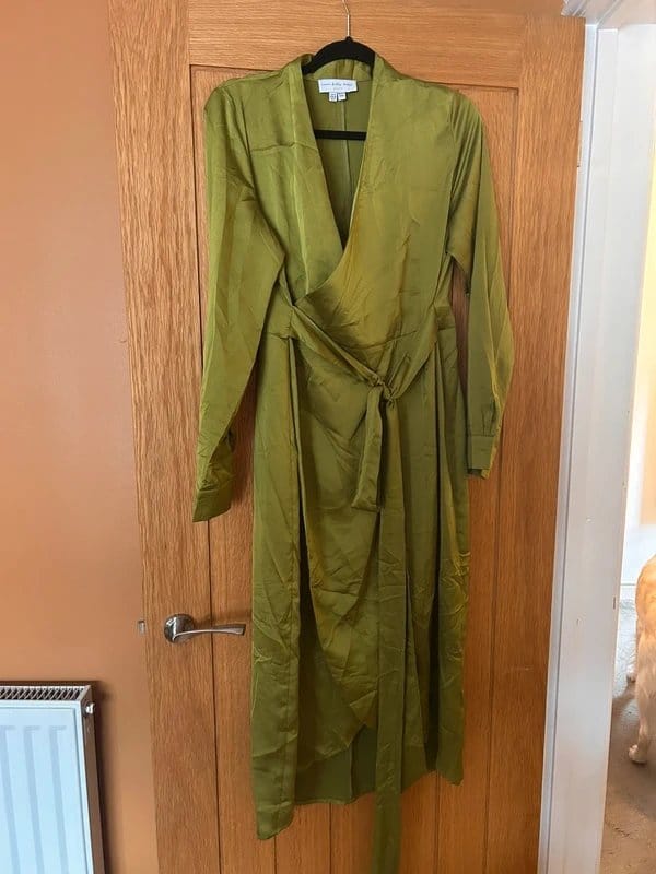 This wrap dress in green can be styled in multiple ways, from a belted waist to a lower cut. Pair it with your favorite trousers or jeans for a versatile look.