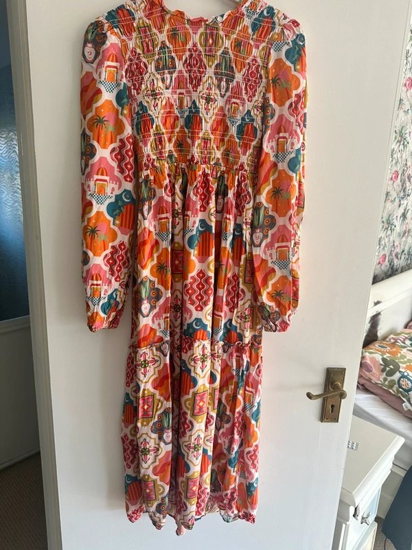 This is a stunning dress and is so gorgeous on you. Super flattering with a ruched bodice and layer at the bottom of the dress in a stunning orange and teal print. Very lightweight as viscose.