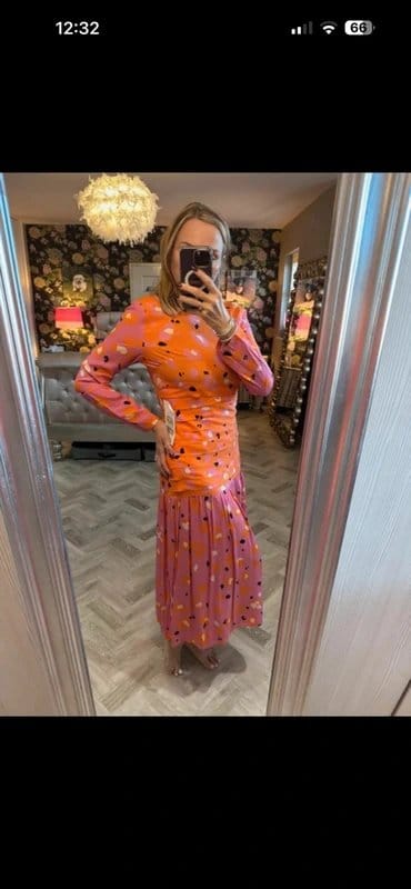See all outfit ideasVibrant multi-coloured dress with a playful abstract pattern. Features a long-sleeve top with a round neckline and a full, flared skirt. Perfect for casual outings or evening events.