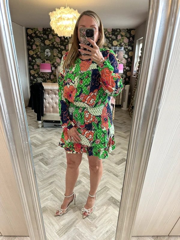 Vibrant floral print midi dress with long sleeves and a round neckline. Perfect for casual outings and special occasions. Crafted from a lightweight fabric with a subtle sheen, it features a flattering empire waist and a flowy silhouette. Ideal for adding a pop of color to your wardrobe.