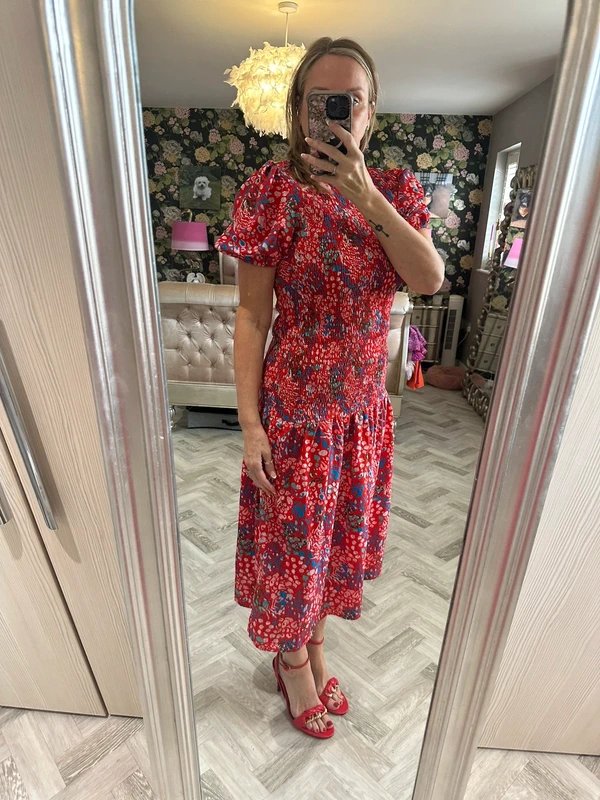 The Never Fully Dressed Floral Midi Dress in Red is available in sizes M.