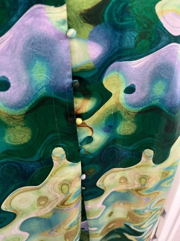 Vibrant multi-colour silk dress by Never Fully Dressed. Features a bold abstract print and button-front closure. Perfect for making a statement at any occasion.
