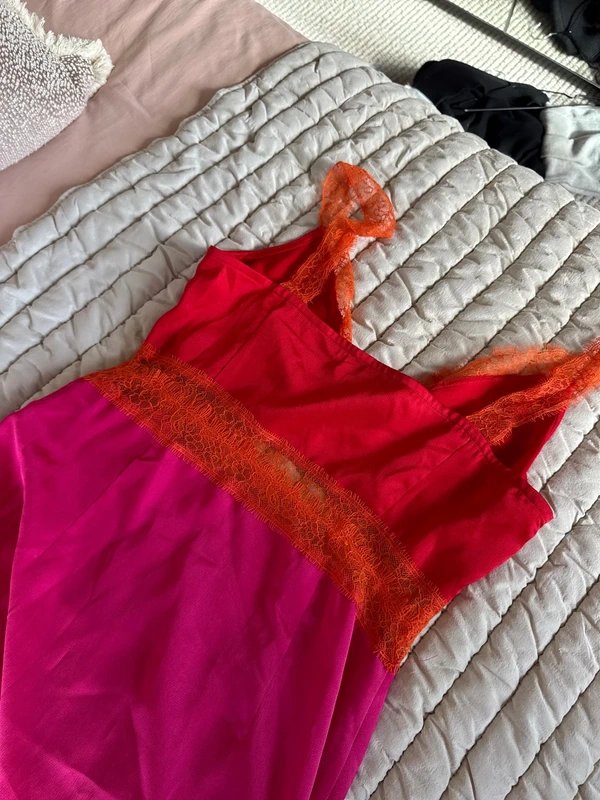 Featuring a lace cut-out satin silk look design, this midi long dress is a vibrant blend of red and pink with striking orange lace. Perfect for an elegant evening out.