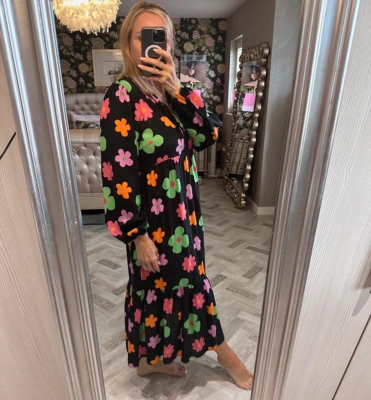Featuring a floral print, this midi dress has a round neckline and long sleeves. Perfect for casual outings.