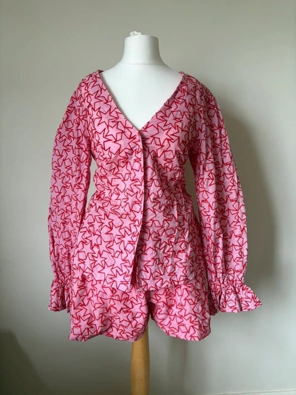 Playful pink & red embroidered co-ord set by Never Fully Dressed. Features a long-sleeved top with a V-neckline and balloon sleeves with ruffled cuffs, paired with high-waisted shorts. Perfect for a casual day out.
