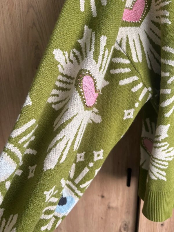 A charming addition to any wardrobe, this Floral Cardigan in green features a playful design with embroidered hearts. Perfect for casual wear, it adds a touch of whimsy to any ensemble.