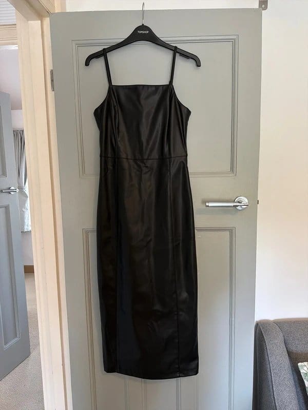 The Never Fully Dressed Black Faux Leather Midi Dress is available in sizes S.