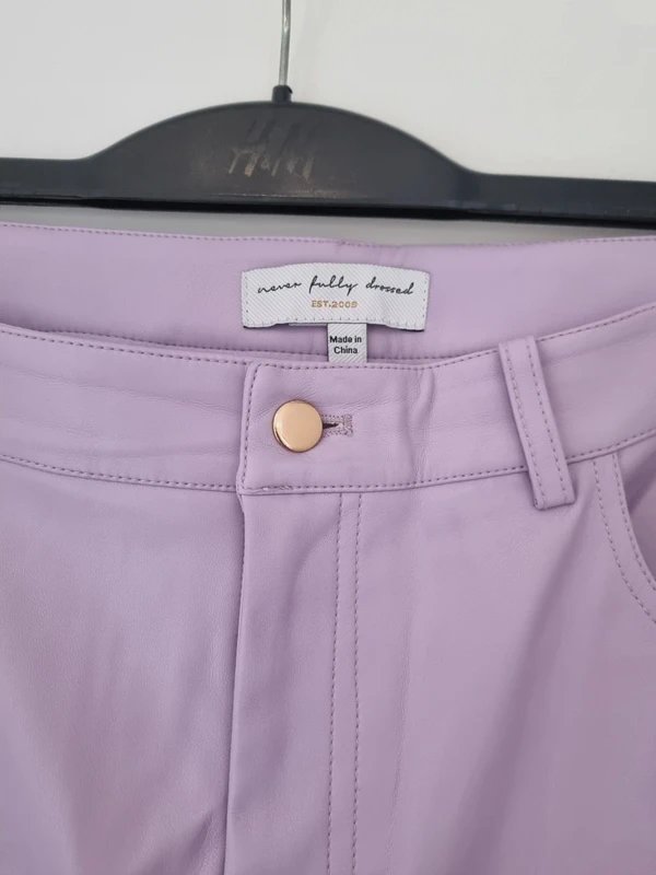 The Never Fully Dressed Faux Leather Trousers in Lilac is available in sizes M.