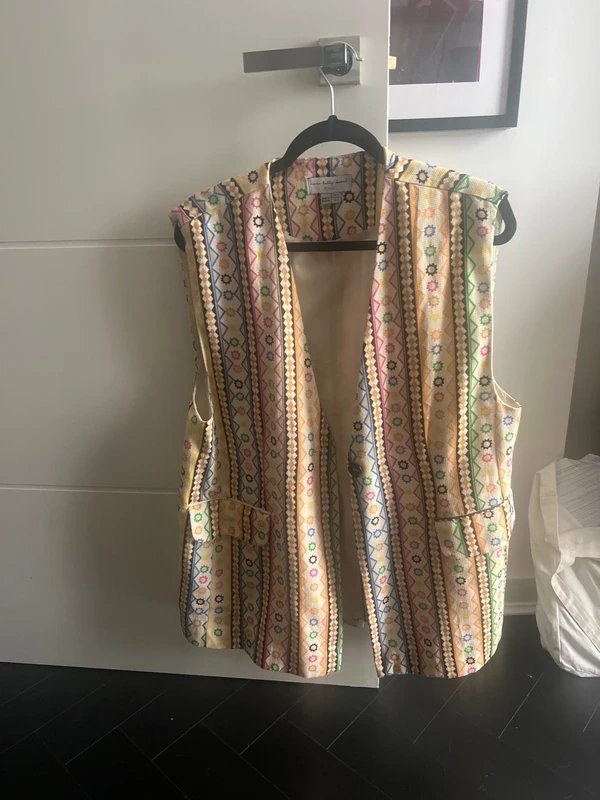 Vibrant multi-print waistcoat and shorts set by Never Fully Dressed. The waistcoat features a longline design with a single button closure and a patterned print. Paired with the matching raya shorts, this set is perfect for a casual yet stylish look. Crafted from a lightweight fabric, it offers comfort and a bohemian vibe.