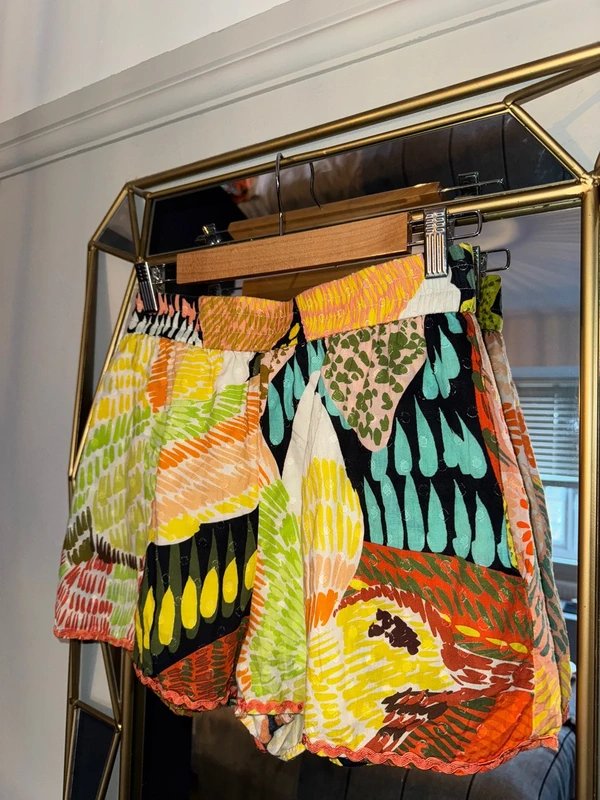 These multi-colored Elizabeth Shorts from Never Fully Dressed feature a fully lined design with orange scalloped lace trim. Perfect for a casual look, these shorts are a vibrant addition to any wardrobe.