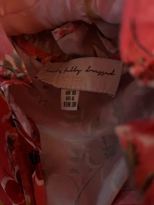 A beautiful pleated floral print Never Fully Dressed dress in Coral. Featuring puffed sleeves for a playful yet elegant look, perfect for casual outings or garden parties.