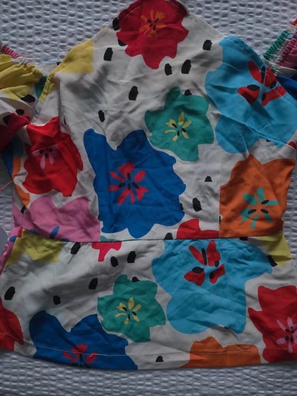 Vibrant floral halter neck top by Never Fully Dressed. Features a multi-coloured floral print with a strappy back and adjustable straps. Perfect for a casual summer look.