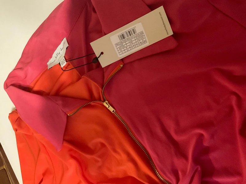 This fuschia and orange ruched midi dress from Never Fully Dressed features a form-fitting silhouette with a front zipper. Made from soft jersey, it is ideal for a vibrant and stylish look.