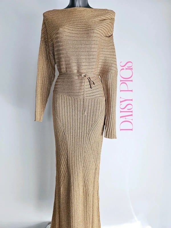 This gold metallic knit dress by Never Fully Dressed features a slash neckline, waist tie, and a flattering fit. The ribbed fine knit construction adds a sophisticated touch, perfect for evening events or special occasions.