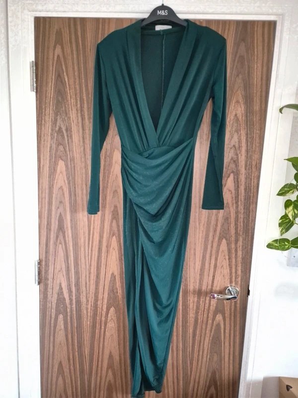 The Never Fully Dressed Dark Green Ruched Maxi Dress is available in sizes S.