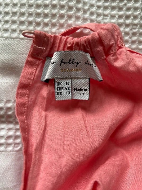 This cotton halter dress by Never Fully Dressed features a vibrant coral pink colour and a loose, flowing silhouette. Perfect for casual summer outings.