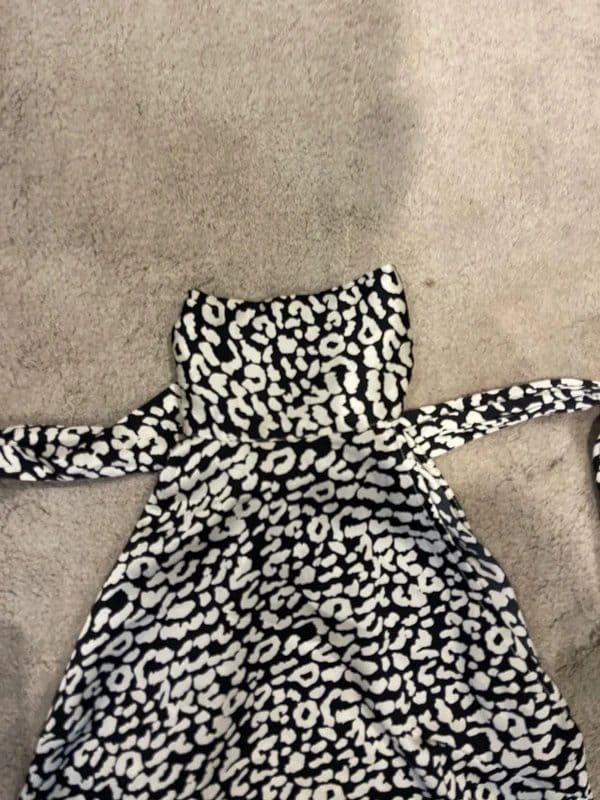 Gorgeous halter-neck top by Never Fully Dressed. Features a black and white leopard print with a fitted bodice and a slightly flared skirt. Perfect for casual outings or evening events.