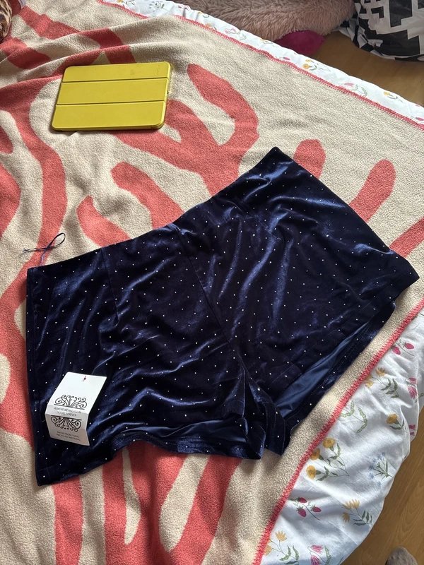 Brand new with tags. Featuring navy velvet, diamond embellishment, and a sleek silhouette, these hot pants are perfect for evening outings.