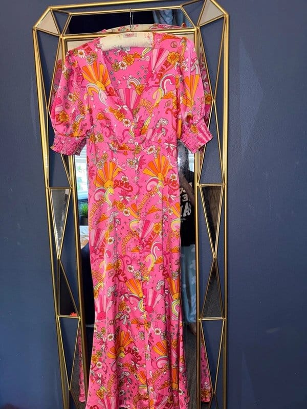 Beautiful pink Kindness Satin Print Dress by Never Fully Dressed. The dress features pearl button up detailing, a statement iconic print, and a flattering fit. Crafted from lightweight satin, it has a relaxed, easy-to-wear style. Perfect for any special occasion.